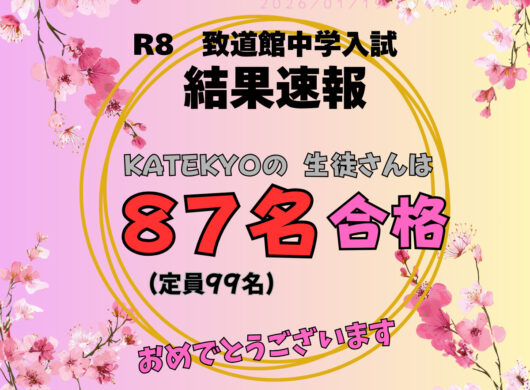 2026年1月10日に中高一貫校「致道館中学校」の受検が行われました KATEKYO学院の生徒さんからは、 87名が合格されました。(定員99名) みなさん、おめでとうございます!! &nbs… 〉〉〉 続きを読む
