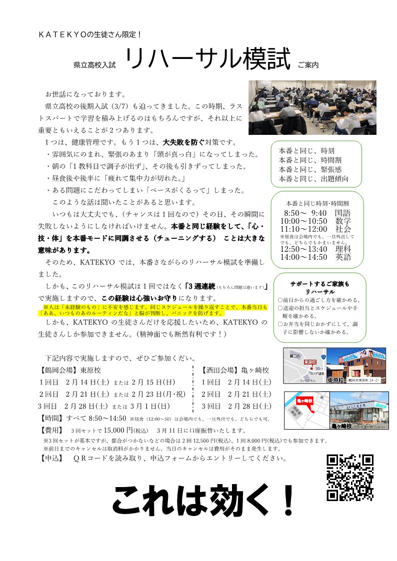 2026年1月10日に中高一貫校「致道館中学校」の受検が行われました KATEKYO学院の生徒さんからは、 87名が合格されました。(定員99名) みなさん、おめでとうございます!! &nbs… 〉〉〉 続きを読む