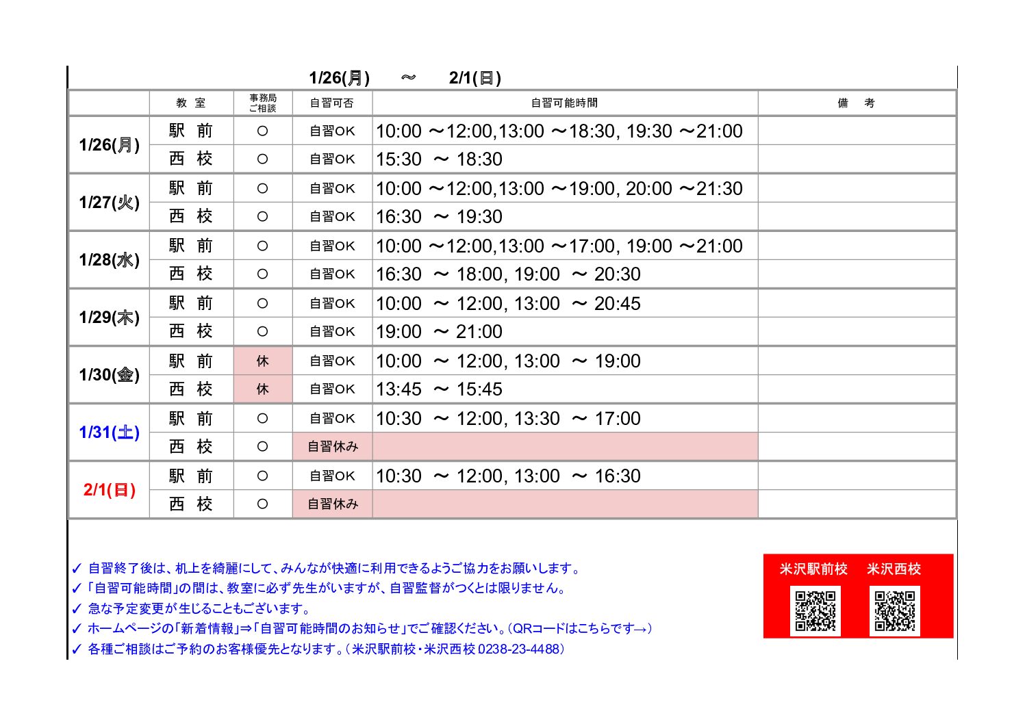 お知らせ TOP お知らせ/新着情報 【米沢駅前・西校】自習可能時間のお知らせ(1/26~2/1) 2026.01.26 【米沢駅前・西校】自習可能時間のお知らせ(1/26~2/1) 「新着情報」一覧へ戻る 2026.01.26 【米沢駅前・西校】自習可能時間のお知らせ(1/26~2/1) NEW 2026.01.24 【酒田】自習可能時間のお知らせ(1/25~2/1) NEW 2026.01.23 【鶴岡泉町】自習室利用時間 NEW 資料請求 無料教育相談お申込み 各教室の最新情報をcheck! ▶山形駅前校 ▶山形南原校 ▶米沢駅前校 ▶米沢西校 ▶長井校 ▶鶴岡泉町校 ▶鶴岡駅前校 ▶鶴岡公園校 ▶鶴岡東原校 ▶鶴岡銀座校 ▶新庄校 ▶東根中央校 ▶天童駅前校 ▶寒河江校 ▶酒田みずほ校 ▶酒田亀ヶ崎校 ▶酒田駅前校