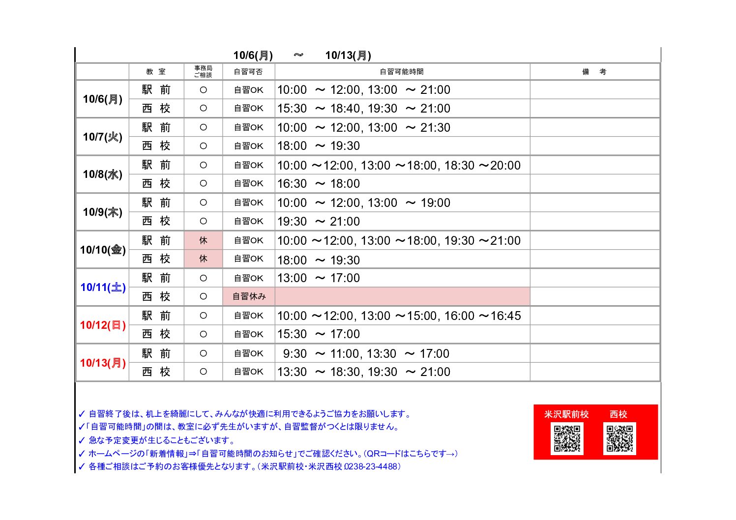 お知らせ TOP お知らせ/新着情報 【米沢駅前・西校】自習可能時間のお知らせ(10/6~10/13) 2025.10.06 【米沢駅前・西校】自習可能時間のお知らせ(10/6~10/13) 「新着情報」一覧へ戻る 2025.10.06 【米沢駅前・西校】自習可能時間のお知らせ(10/6~10/13) NEW 2025.10.04 【酒田】自習可能時間のお知らせ(10/6~10/12) NEW 2025.10.03 【鶴岡泉町】自習室利用時間 NEW 資料請求 無料教育相談お申込み 各教室の最新情報をcheck! ▶山形駅前校 ▶山形南原校 ▶米沢駅前校 ▶米沢西校 ▶長井校 ▶鶴岡泉町校 ▶鶴岡駅前校 ▶鶴岡公園校 ▶鶴岡東原校 ▶鶴岡銀座校 ▶新庄校 ▶東根中央校 ▶天童駅前校 ▶寒河江校 ▶酒田みずほ校 ▶酒田亀ヶ崎校 ▶酒田駅前校