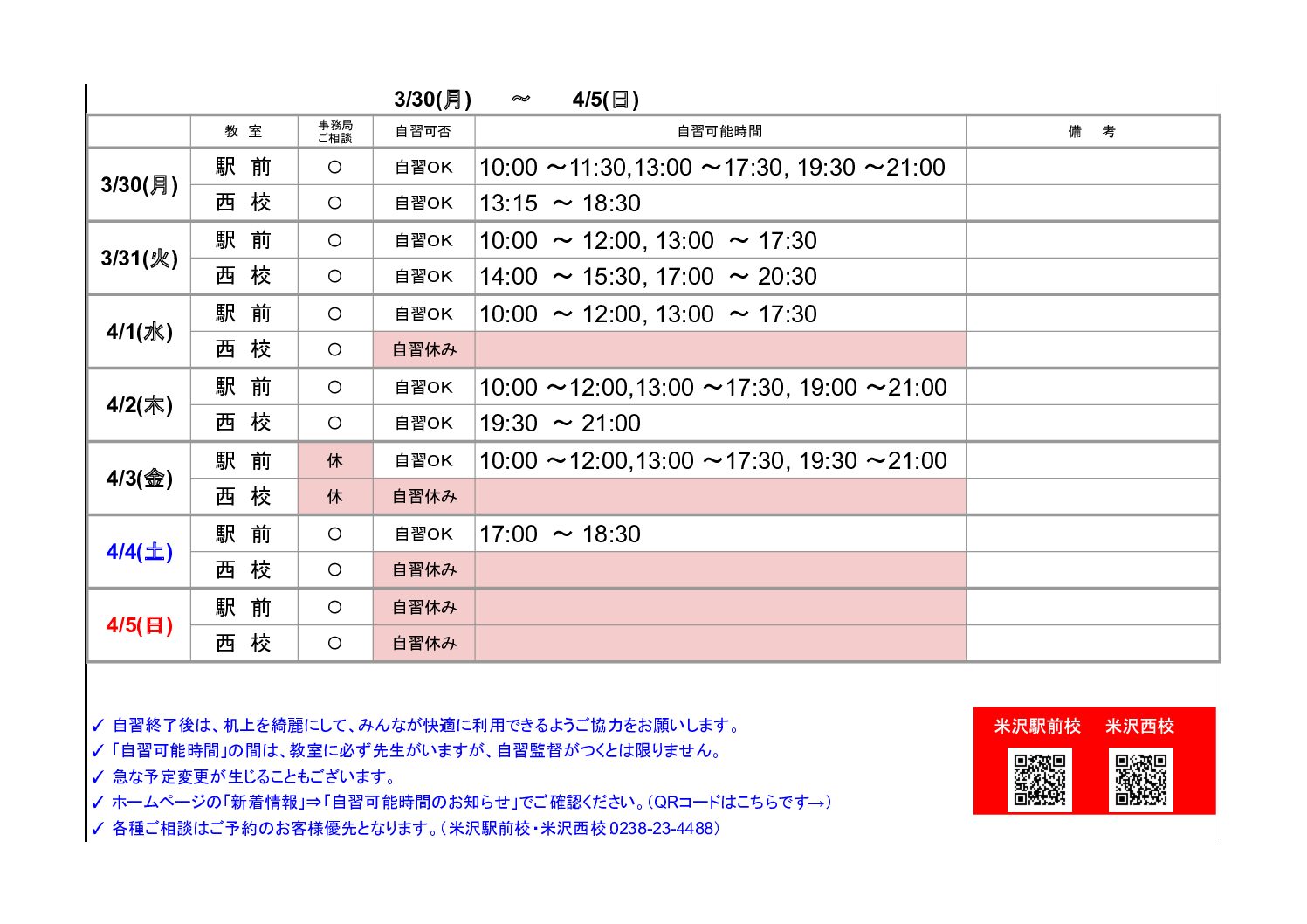 お知らせ TOP お知らせ/新着情報 【米沢駅前・西校】自習可能時間のお知らせ(3/30~4/5) 2026.03.29 【米沢駅前・西校】自習可能時間のお知らせ(3/30~4/5) 「新着情報」一覧へ戻る 2026.03.29 【米沢駅前・西校】自習可能時間のお知らせ(3/30~4/5) NEW 2026.03.27 【鶴岡泉町】自習室利用時間 NEW 2026.03.23 【米沢駅前・西校】自習可能時間のお知らせ(3/23~3/29) NEW 資料請求 無料教育相談お申込み 各教室の最新情報をcheck! ▶山形駅前校 ▶山形南原校 ▶米沢駅前校 ▶米沢西校 ▶長井校 ▶鶴岡泉町校 ▶鶴岡駅前校 ▶鶴岡公園校 ▶鶴岡東原校 ▶鶴岡銀座校 ▶新庄校 ▶東根中央校 ▶天童駅前校 ▶寒河江校 ▶酒田みずほ校 ▶酒田亀ヶ崎校 ▶酒田駅前校