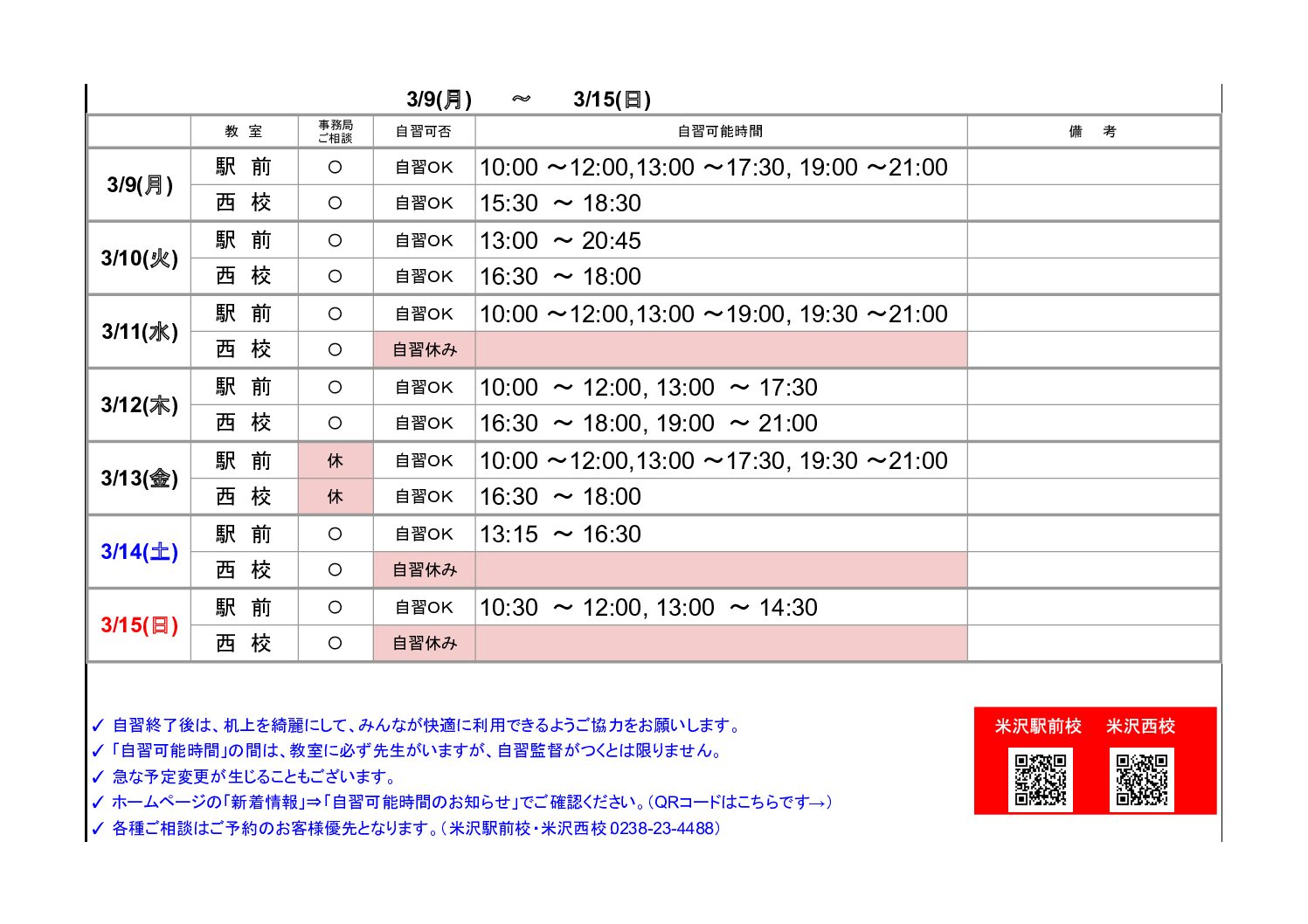 お知らせ TOP お知らせ/新着情報 【米沢駅前・西校】自習可能時間のお知らせ(3/9~3/15) 2026.03.09 【米沢駅前・西校】自習可能時間のお知らせ(3/9~3/15) 「新着情報」一覧へ戻る 2026.03.09 【米沢駅前・西校】自習可能時間のお知らせ(3/9~3/15) NEW 2026.03.07 【酒田】自習可能時間のお知らせ(3/8~3/15) NEW 2026.03.06 【鶴岡泉町】自習室利用時間 NEW 資料請求 無料教育相談お申込み 各教室の最新情報をcheck! ▶山形駅前校 ▶山形南原校 ▶米沢駅前校 ▶米沢西校 ▶長井校 ▶鶴岡泉町校 ▶鶴岡駅前校 ▶鶴岡公園校 ▶鶴岡東原校 ▶鶴岡銀座校 ▶新庄校 ▶東根中央校 ▶天童駅前校 ▶寒河江校 ▶酒田みずほ校 ▶酒田亀ヶ崎校 ▶酒田駅前校