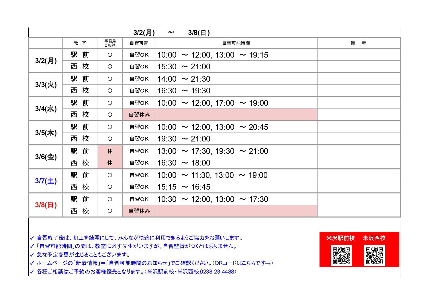 【米沢駅前・西校】自習可能時間のお知らせ(3/2~3/8)