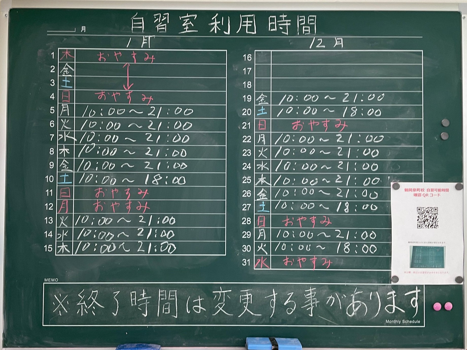 鶴岡泉町校の自習室利用時間は画像の通りです。 急な変更が出る場合もありますので、教室に来る前にもう一度確認してください。 感染症や自然災害等で学校・学年・学級が休業中の方は自習室の利用ができません。…